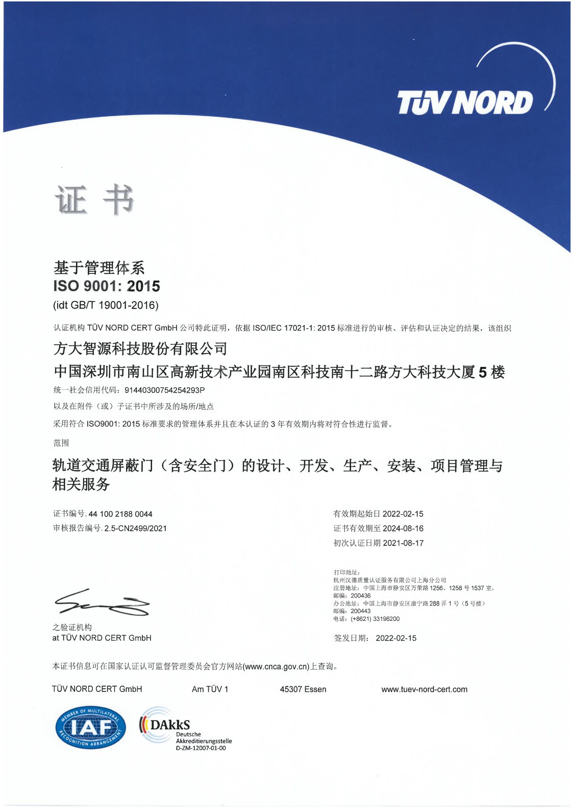 ISO9001:2015 Quality Management System Certificate